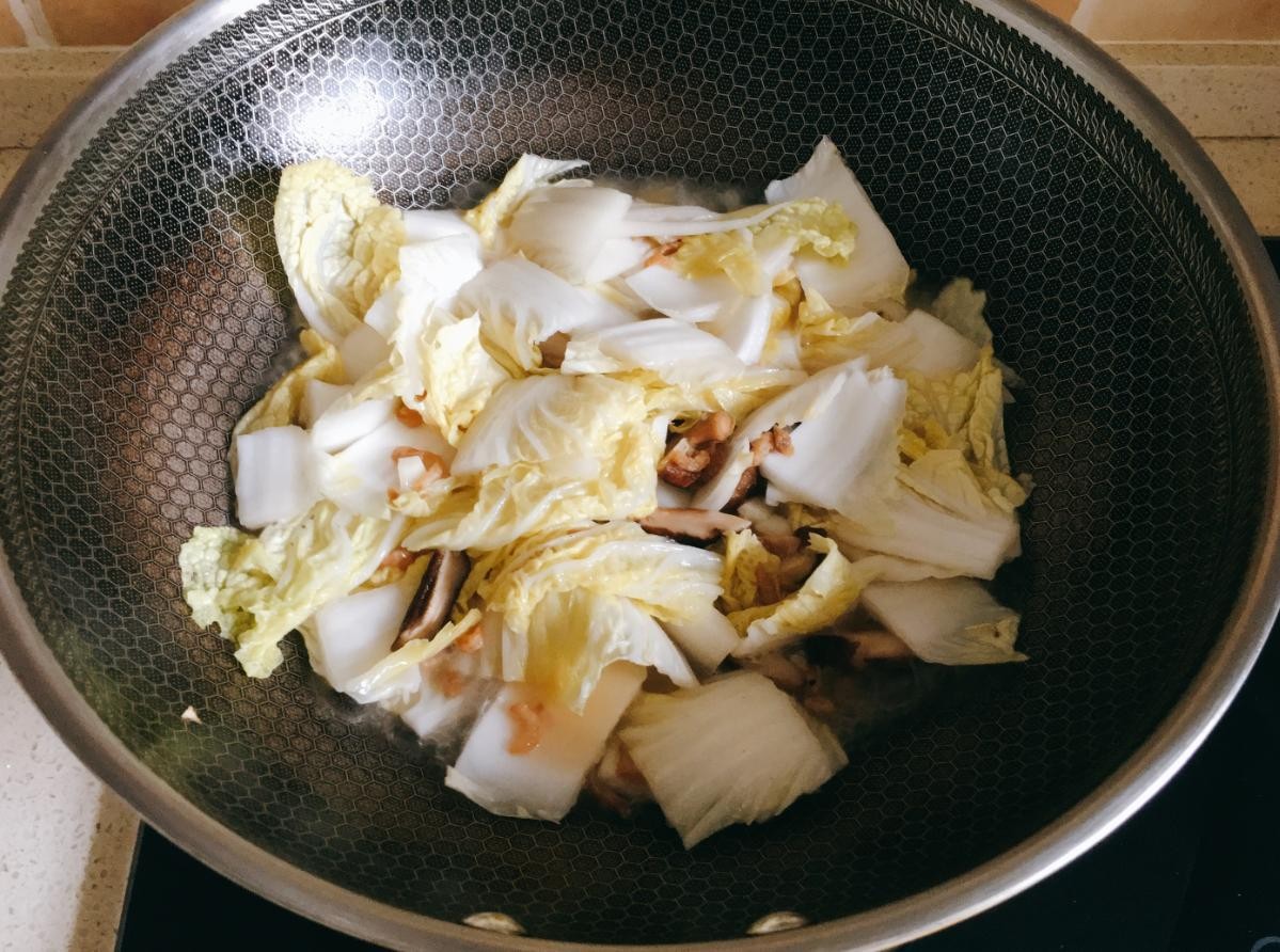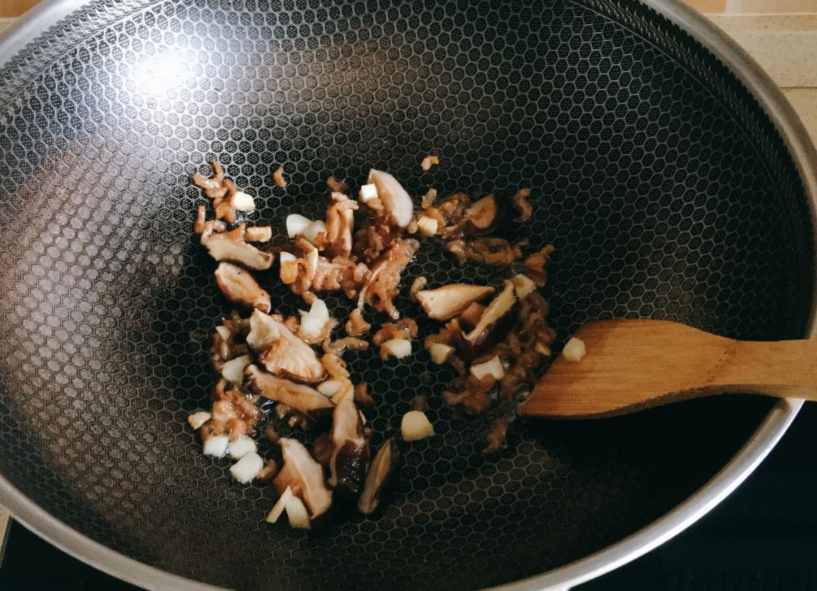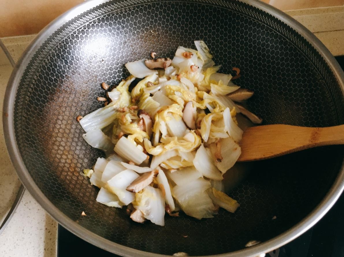 ③ 热锅,加入2大匙油烧热,放入蒜末爆香,加入沥干水的香菇和虾米一起炒香后,放入白菜片炒至微软。