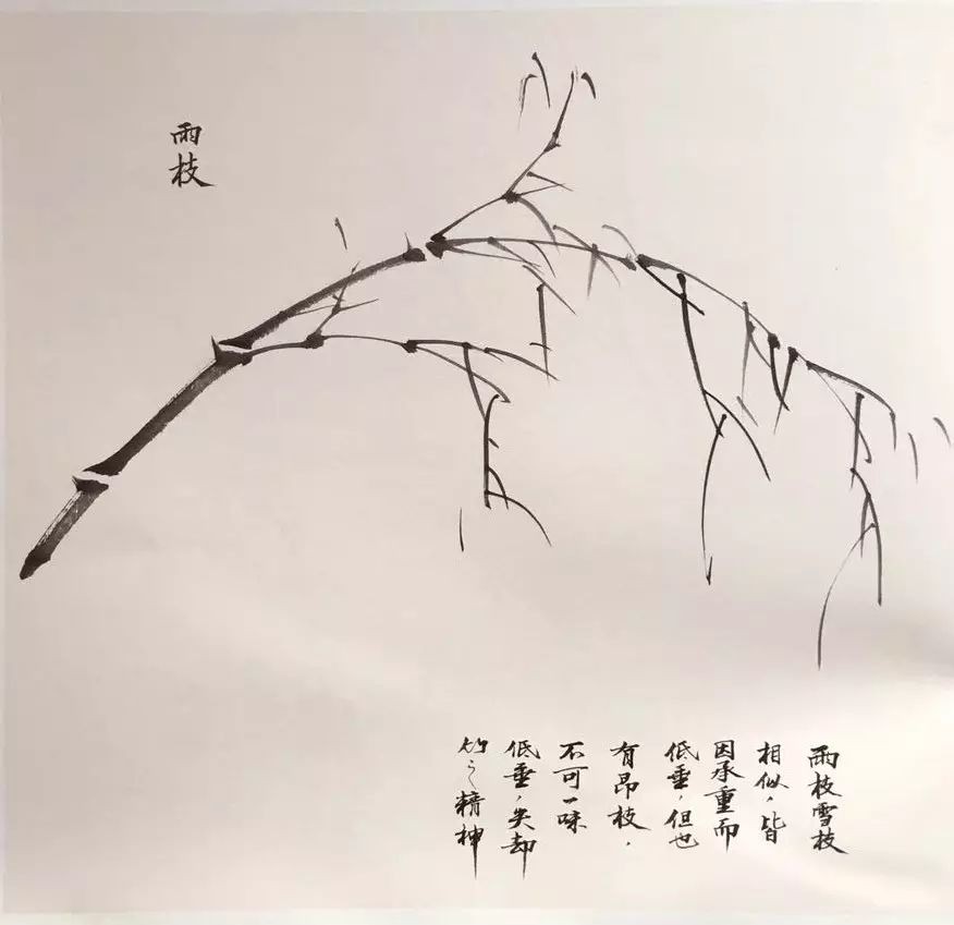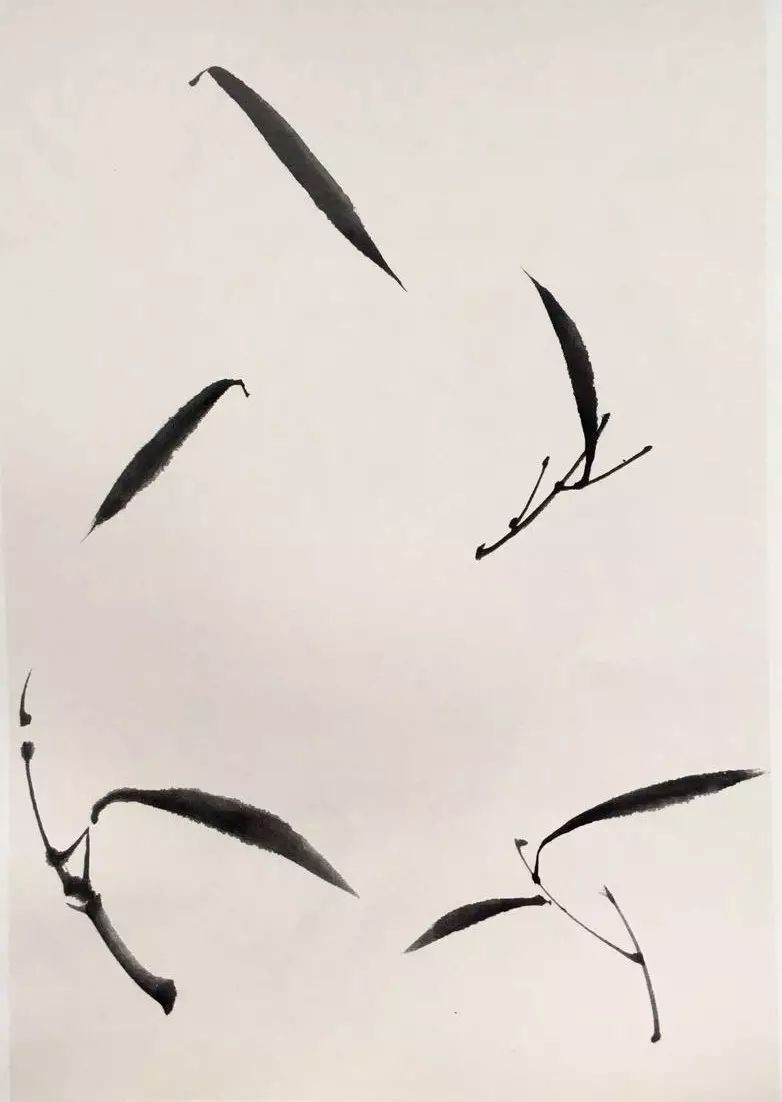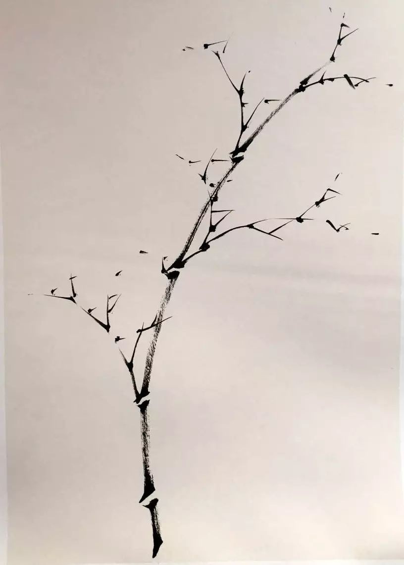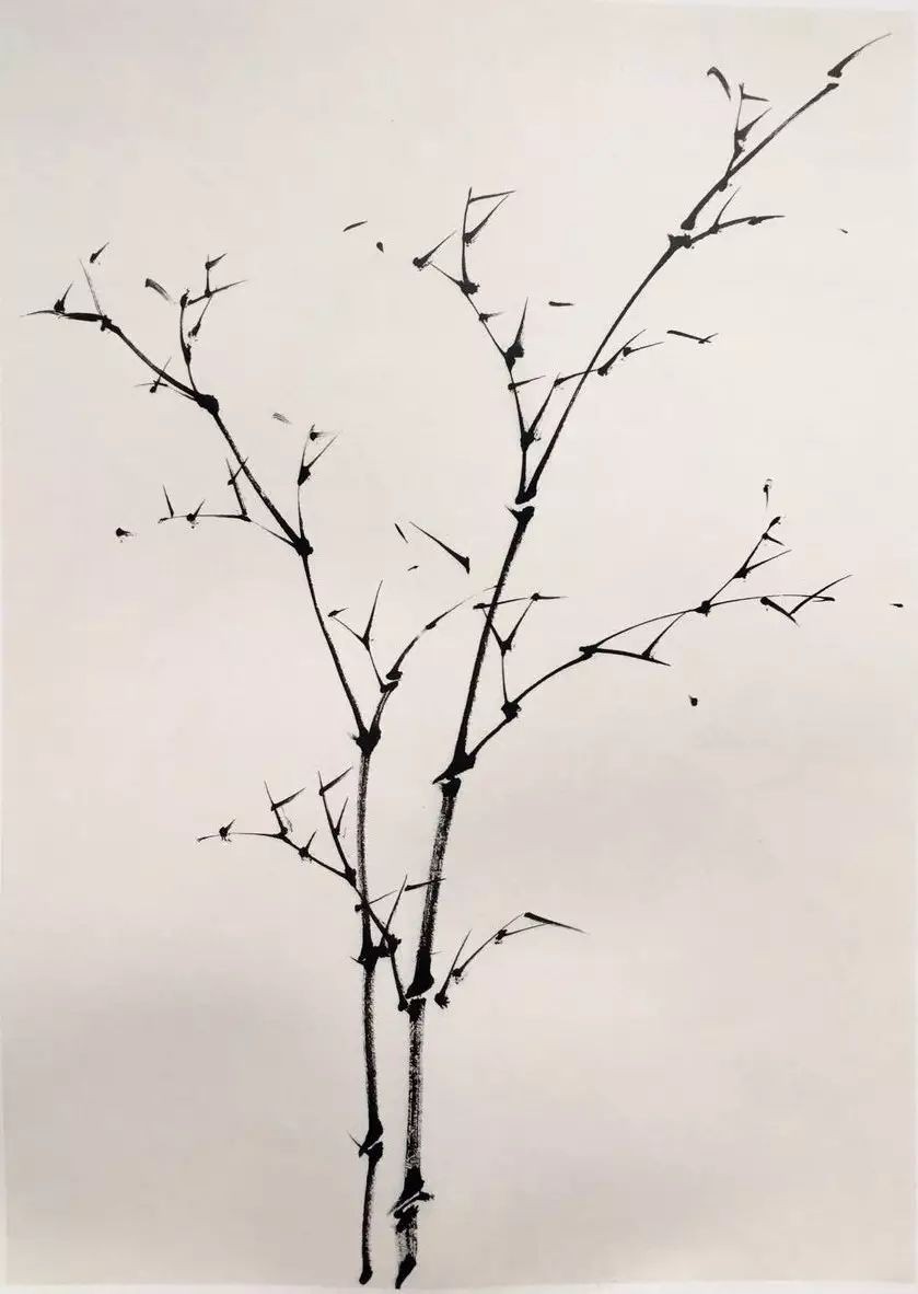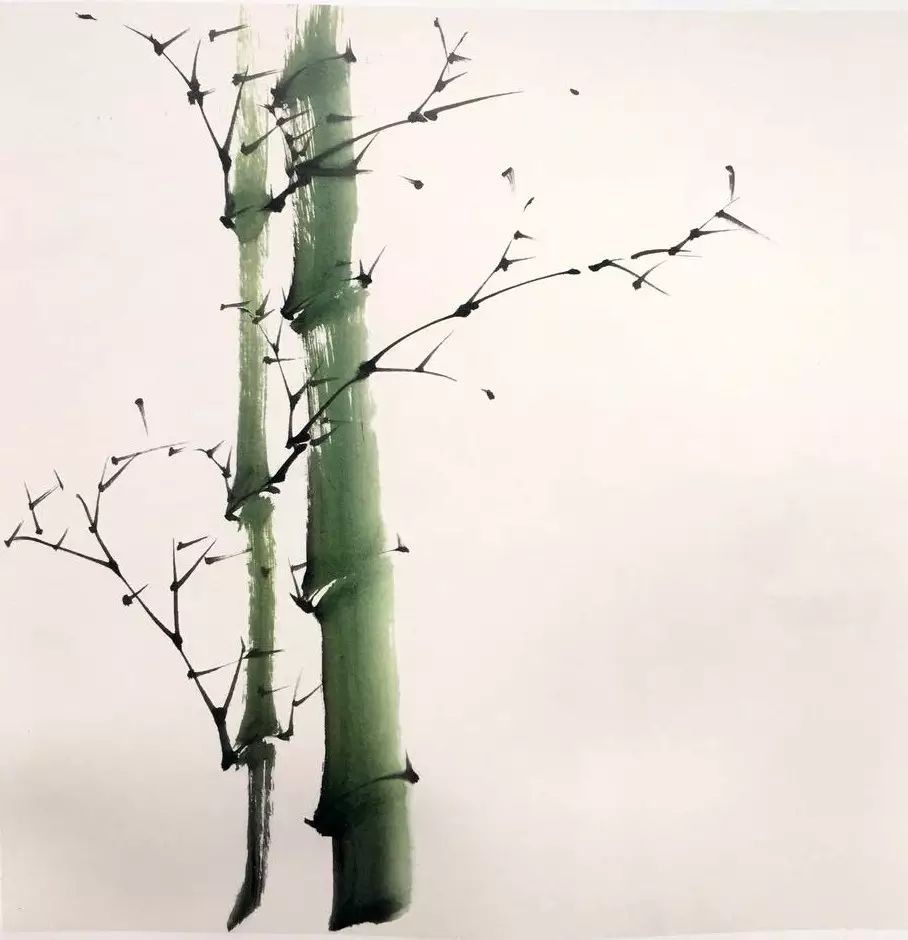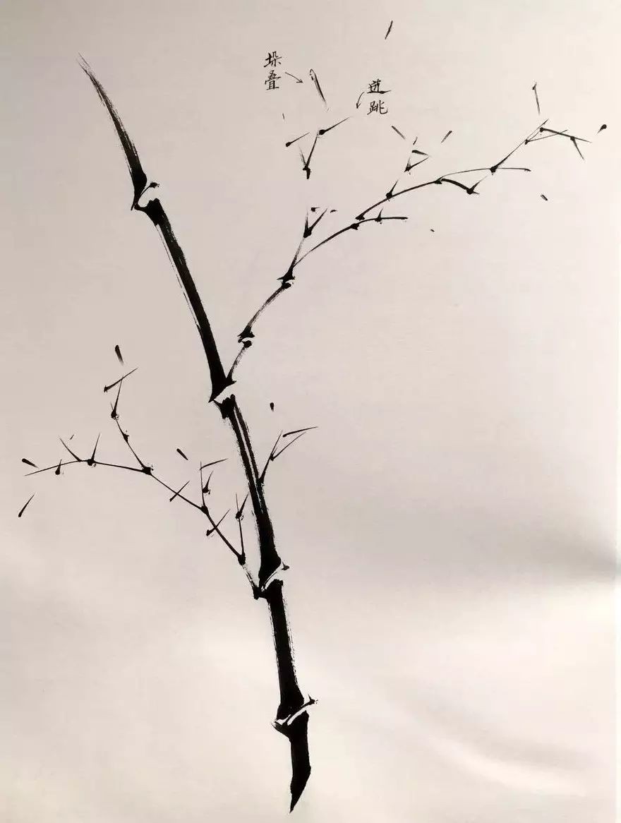 通常情况下,竹竿离地五节始生枝,竹枝互生。绘制时需注意枝的长度与方向,笔触挺拔有力,行笔流畅。小枝的画法亦有讲究,古人称之为“迸跳”与“垛叠”,应兼而有之。枝节的出枝不必节节画出,可根据画面需要进行省略。