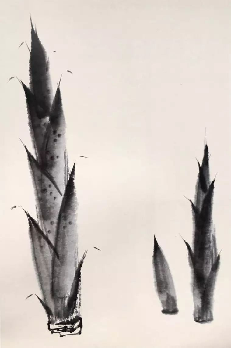 竹笋的绘制需按照其结构进行,侧锋用笔,一左一右交替绘制。不同种类的竹子其竹笋的形状也各不相同,因此需仔细观察并准确表现。