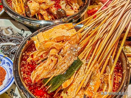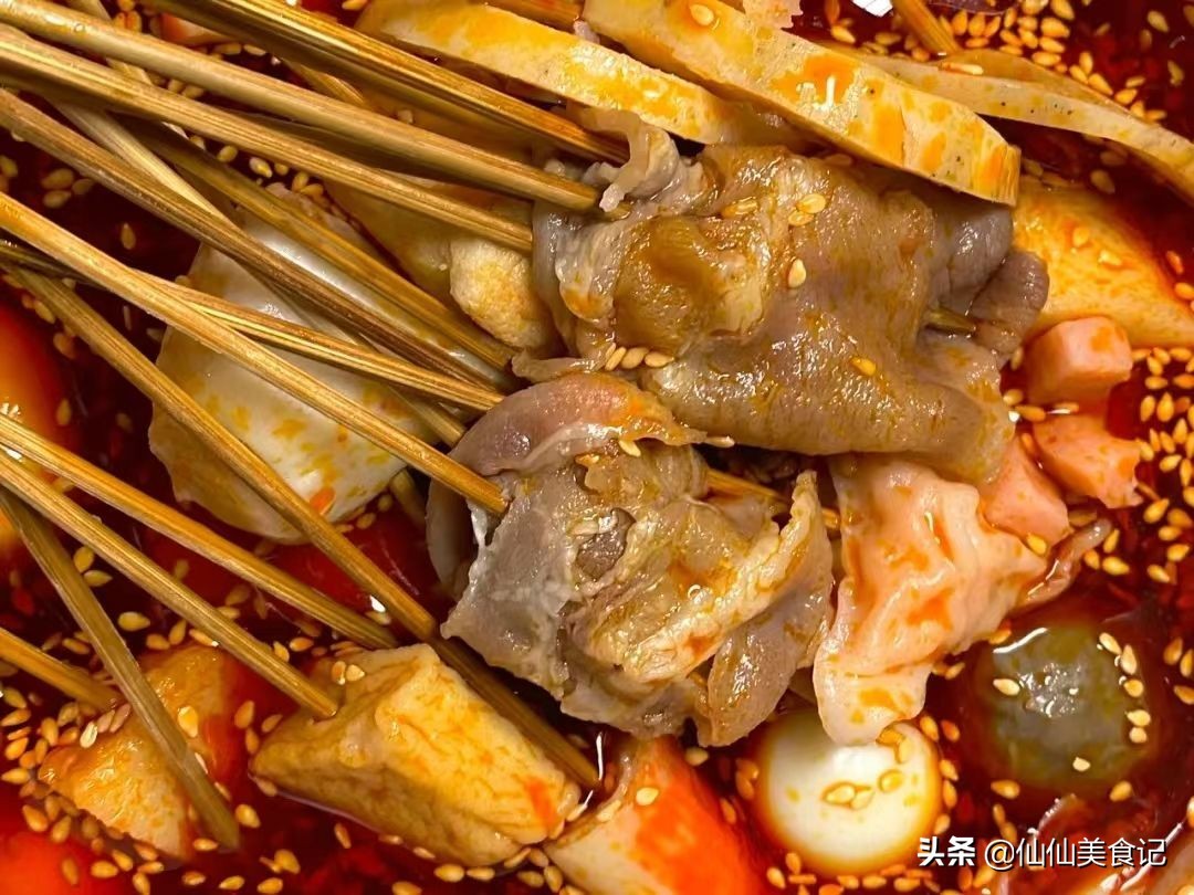 钵钵鸡有香辣、红油,藤椒、五香等口味,菜品种类也很多,可以自己荤素搭配,有小郡肝、掌中宝、牛肉、豆皮等,你想吃的基本都有。红油钵钵鸡是最有名的,裹满了芝麻巨香,非常浓郁的红油味,每一串肉都很大颗,需要自己自选。