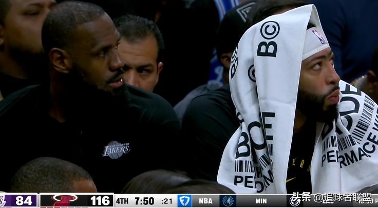 末节詹姆斯继续带队抵抗,可湖人落后太多,比赛早早失去悬念,比赛还剩8分44秒,詹姆斯下场并且提前认输,连续两场被打爆真是太惨了;詹眉坐在替补席,都是一脸无奈和沮丧。