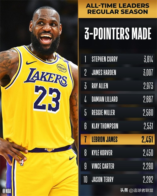 1、詹姆斯生涯三分命中数达到2451记,正式超越科沃尔(2450记三分)升到历史三分榜第七位,独享历史第七