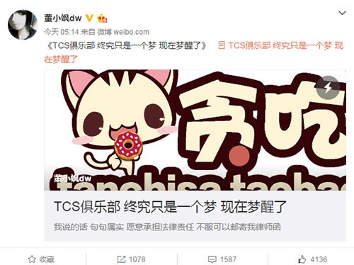 董小飒微博宣布解散TCS战队 曝选手糜烂生活