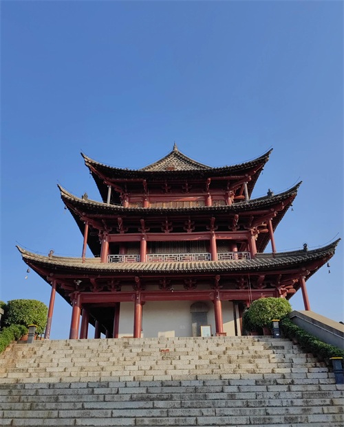 朝阳楼有三层飞檐,高24.45米。西面“飞霞流云”风流蕴藉,东面“雄镇东南”威风凛凛,一刚一柔,相得益彰。