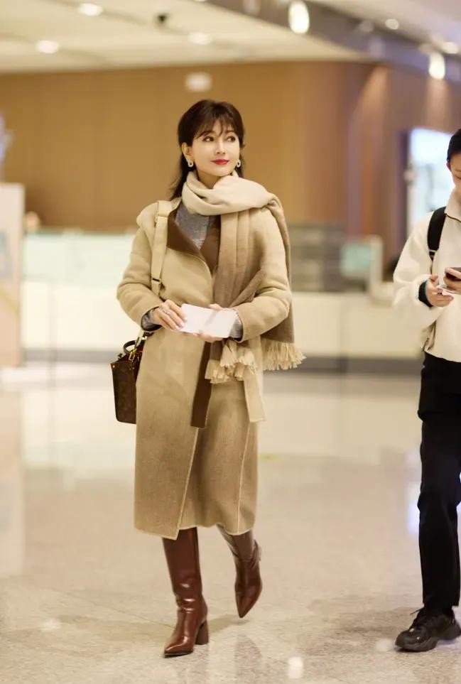 除了大衣的亮眼表现,赵雅芝的搭配也同样值得称道。她选择了一条米色加咖啡色的拼色大围巾,围巾的质地柔软,色彩搭配和谐,既起到了保暖的作用,又为整体造型增添了几分层次感。同时,她脚踏一双深棕色的长靴,靴子的款式简约而不失时尚感,与大衣和围巾的色彩形成了完美的呼应。
