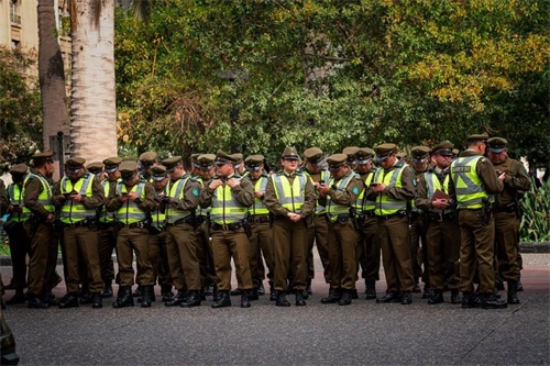 广场四周有国家邮政局、历史博物馆和圣地亚哥市政府,这些都是圣地亚哥的代表性建筑物。 广场上一队列的警察,多数却在玩着手机。