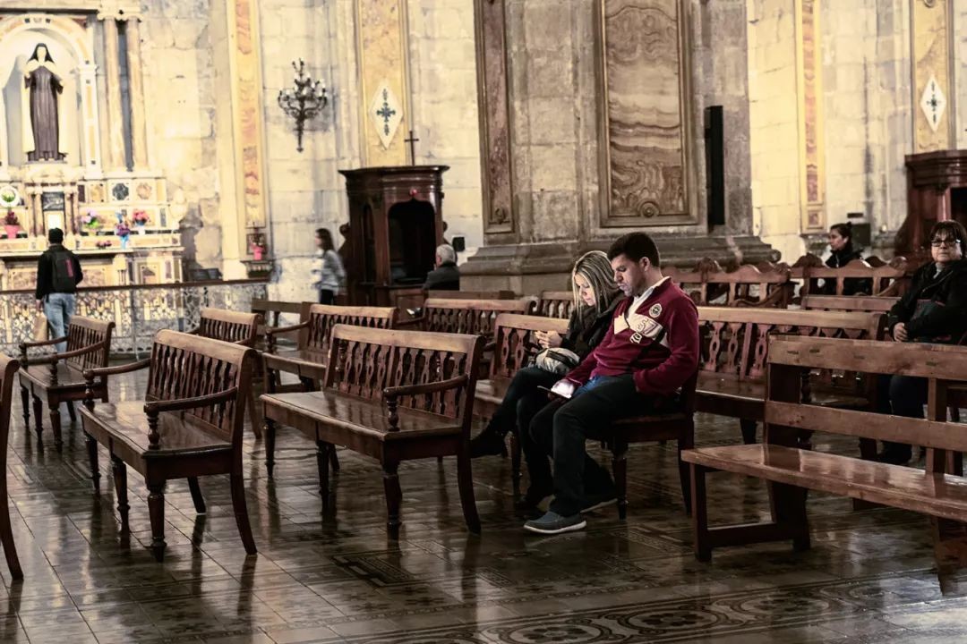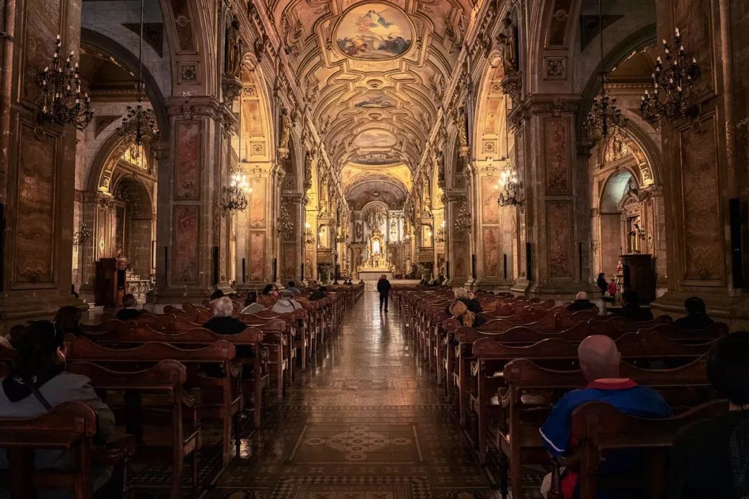教堂内氛围宁静神圣,拱形长廊内,人们欣赏着新古典主义精美的雕栏石砌,或祷告,或静思。