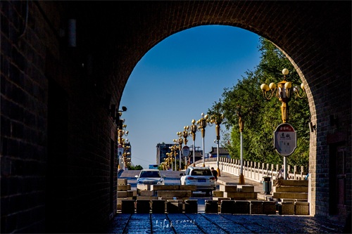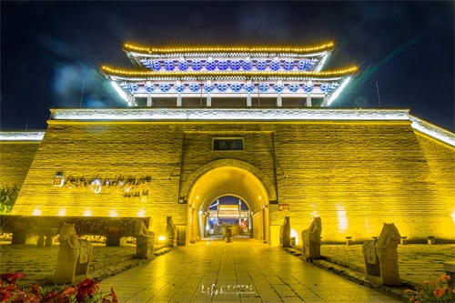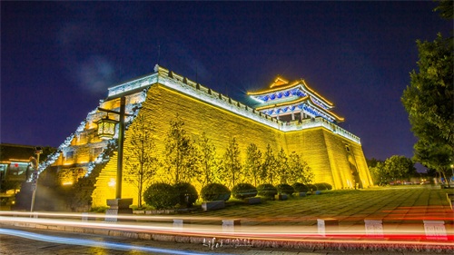 古城外的车子绕着南城门而过,一道道光影在城门、城墙前划过,色彩斑斓,恍若历史与当下交织融合,生出一道道别样的光芒来。