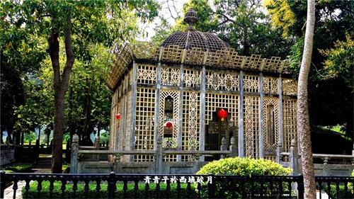 花藤亭,该是女性们都很喜欢的地方,感觉很浪漫,如果在这里读书、品茶、弹奏乐器、聊天的话,一定很美吧。这里顶部仿英国女皇金冠而建,四壁用钢筋水泥做成通花花笼。据记载:当时四角各种上春夏秋冬四季藤木花卉,攀爬亭上,一年四季花开不辍,当年客人未进花园先闻花香,亭中有水池,相传为养龟池,与亭侧鸟巢相联系,寓意鸟语花香,花开富贵。的确,纵观立园的每一处,其构建都有很深刻的寓意和内涵。