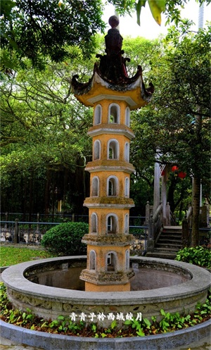 风火塔,共五层,琉璃瓦顶,塔身六角型,浅泥黄色,拱形塔窗,白色饰边,用一直径4米圆池围住,池中植有睡莲并放养金鱼。据说此塔取材于《封神榜》中托塔天王李靖手中的宝塔,意为塔镇一方,祈求平安。