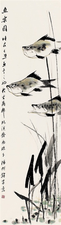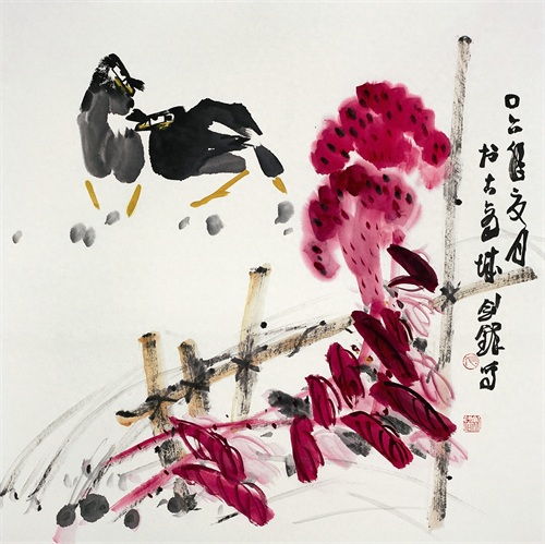 他还主攻花鸟画,他的画构图简约而不简单,画中的一花一草、一虫一鱼,尽显个人性情,小尺幅中能见大境界。加之他有深厚的行草笔法功底,落款题字,悠然自得,比起一些不善写字的画家来则更有一种优势。书与画笔法本同源生发,二者结合相得益彰,使画作平添几分艺术魅力。