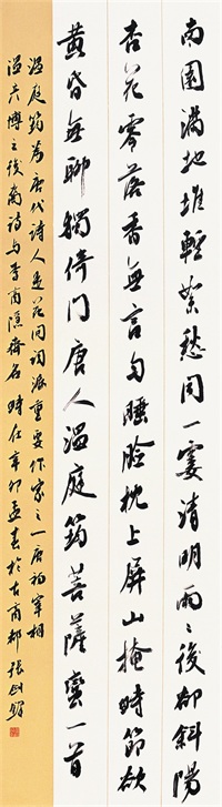 写行书,他先后从虞世南、欧阳询、颜真卿、柳公权、张猛龙中汲取传统营养,打下深厚的传统功底,最后从苏轼、米芾二家出,兼收当代大家沙孟海等人的书法审美素质。其风格有颜之浑厚,米之淋漓,苏之绵密。但对于个体风格的形成他从不刻意地去追求,而是顺其自然,水到渠成,瓜熟蒂落。他的字趋向于点画俊秀、舒展流畅、节奏明快,自然流露出一股浓浓的书卷之气。