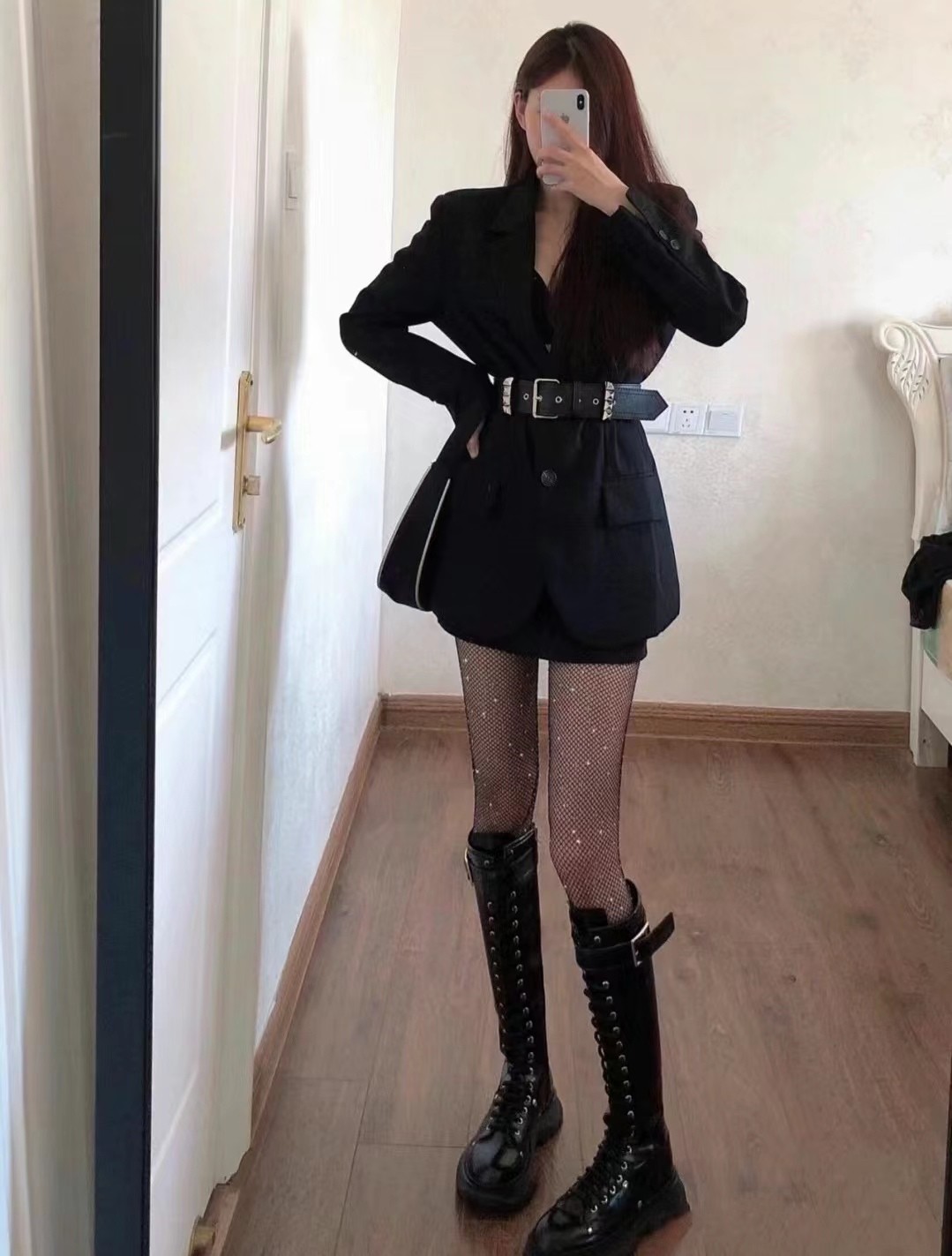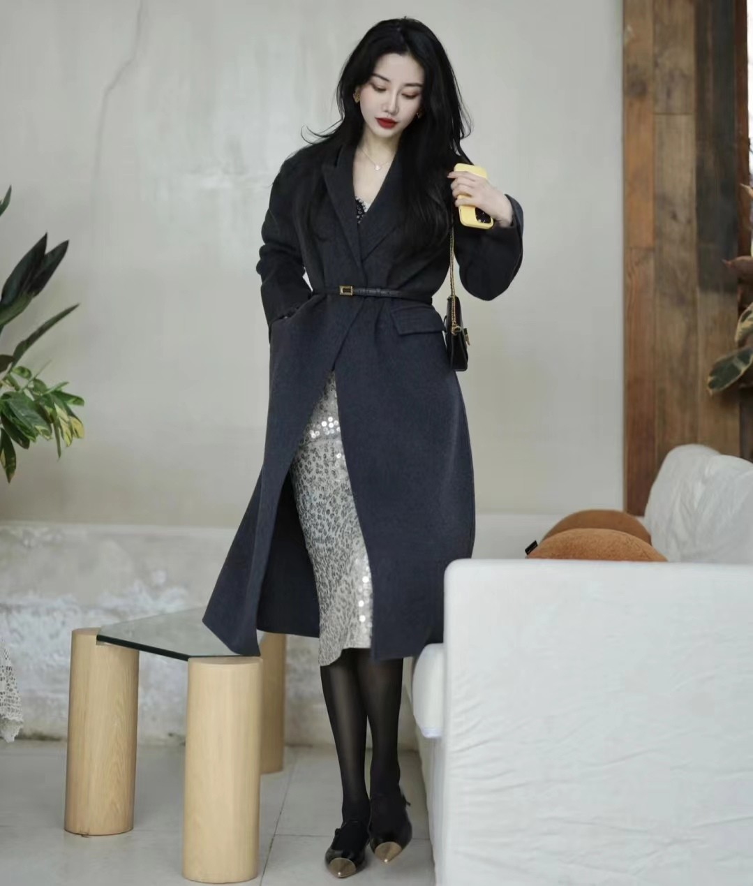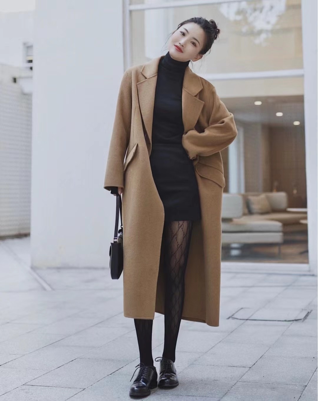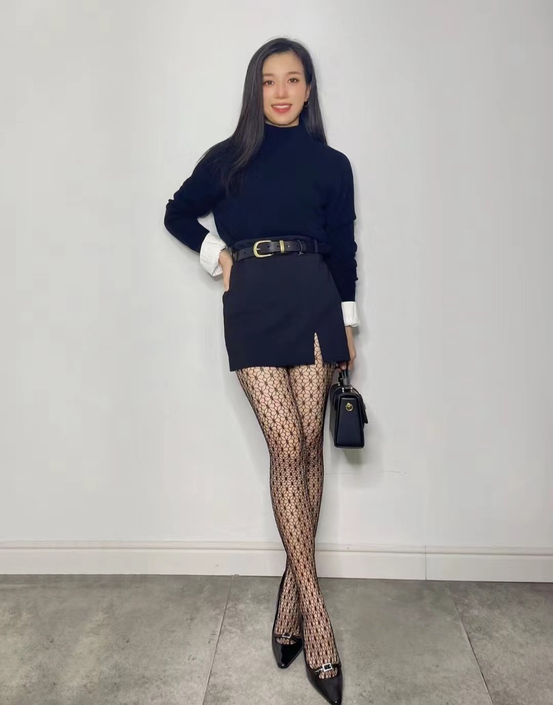 深色丝袜在视觉上具有显瘦效果,能让腿部线条更加修长。同时,深色丝袜给人一种神秘、优雅的感觉,适合搭配冬季的深色系服装。