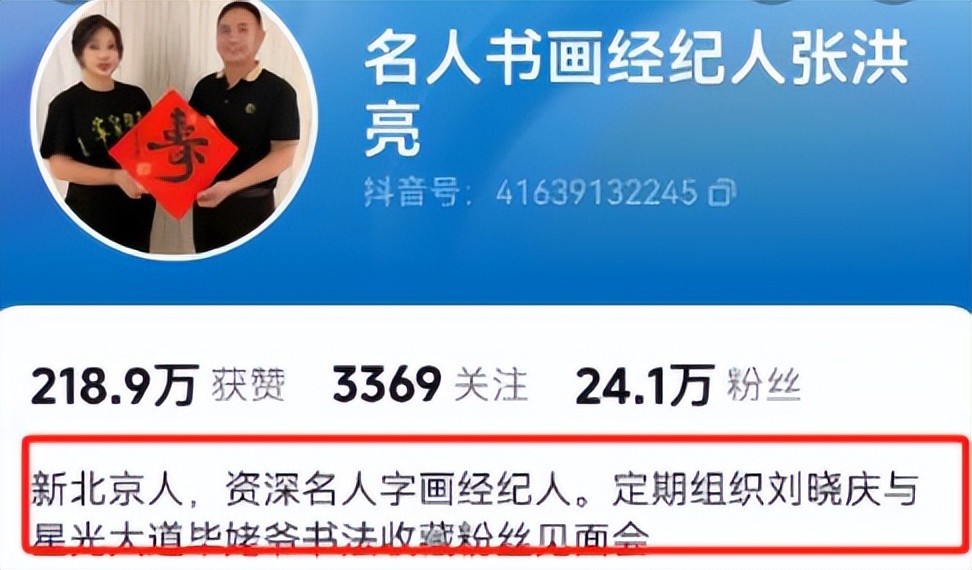 后来多年过去,短视频平台成为了当下最流行的社交媒介。而一位名叫“张洪亮”的名人书画经纪人很快就引起了不少人的关注,因为在他的简介里,居然直截了当的出现了“毕姥爷”几个字。