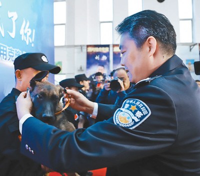 民警为克隆犬佩戴刻有名字并象征入警的专属项圈。