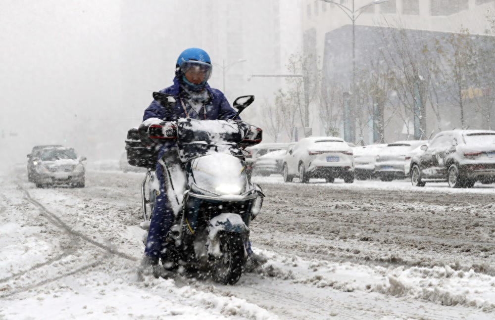 11月6日,在沈阳市浑南区,一位外卖员在雪中送外卖。新华社记者 李钢 摄