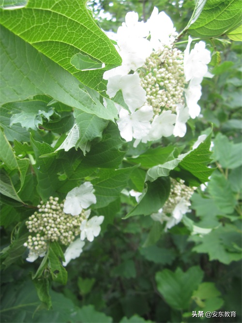 鸡树条荚蒾复伞形花序顶生,密花,外围有不孕性的辐射状小花,花冠白色,内面为乳白色杯状花冠的小花,特别漂亮,野外山林中很抢眼。