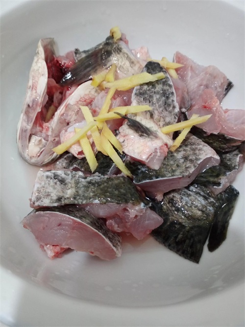 第二步,撒适量食盐,胡椒粉,生姜,料酒腌制分钟