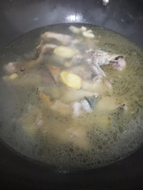 第四步,加入适量开水,这一步很重要哦,一定要加开水熬,加凉水熬的鱼汤颜色不白,中途加水也会影 响鱼汤的色泽