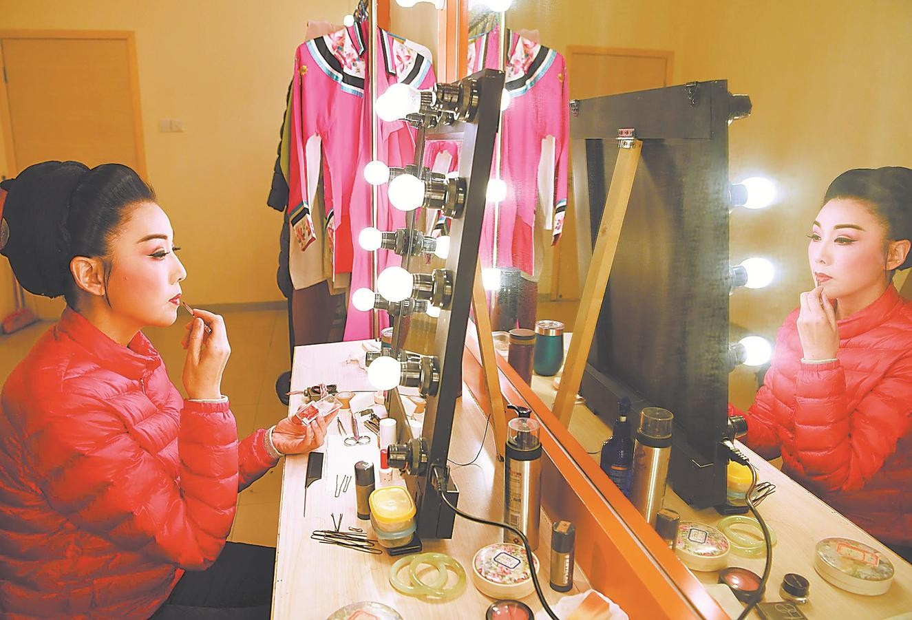 12月6日,在安徽大剧院后台,韩再芬精心装扮。