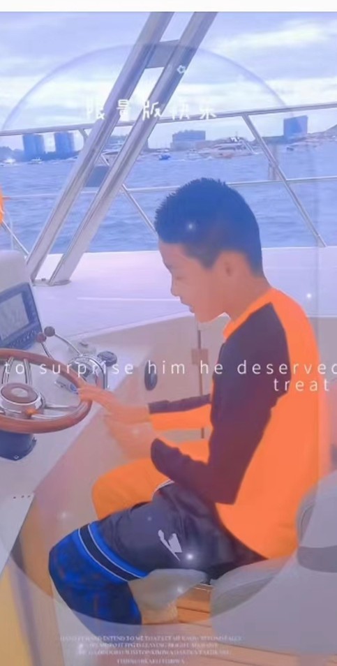 另外一家人还租用了一艘豪华游艇,12岁的虎头还尝试当了一次司机,在专业司机看护下,在宽广的大海中,即便虎头不会开船,随意摆弄方向也不会出现大问题,在大海中,虎头非常大胆,还尝试了一次海上冲浪,在游艇飞速有力的拉动下,虎头在大海上飞驰,没想到他平衡感极强,全程都十分稳健,一只手拉着绳子,一只手举过头顶,十分兴奋。