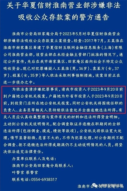 2023年8月23日,关于华夏信财淮南营业部涉嫌非法吸收公众存款案的通告发布。