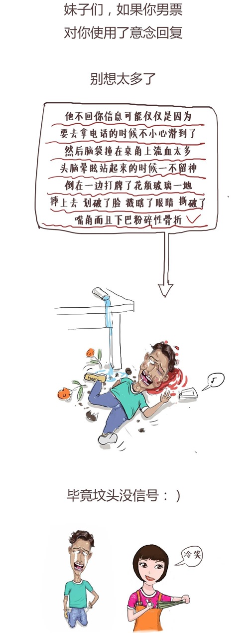 他不回你信息可能仅仅是因为要去拿电话的时候不小心滑到了然后脑袋撞在桌角上流血太多头脑晕眩站起来的时候一不留神倒在一边打牌了花瓶玻璃一地摔上去 划破了脸 戳瞎了眼睛 撕破了嘴角而且下巴粉碎性骨折。