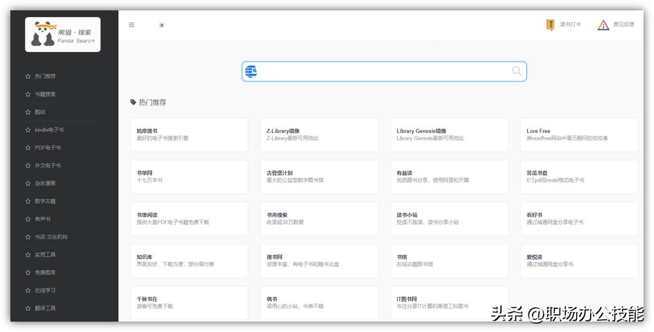 喜欢看电子书的小伙们有福了,熊猫搜书是一个让人惊艳的电子书导航网站。它聚合了20多个电子书网站,并且每个网站的质量都是非常高,它的界面简洁清新,随意切换各种不同的网站。