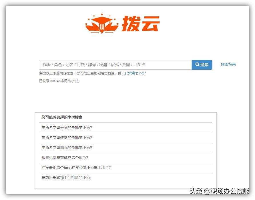 这个网站主要以小说为主,收录了30多万小说信息,哪怕你只记得小说中的角色名、地名、武功招式、门派等一点点信息,也能够通过模糊搜索,找到你想要的那本书,真是太强大了。
