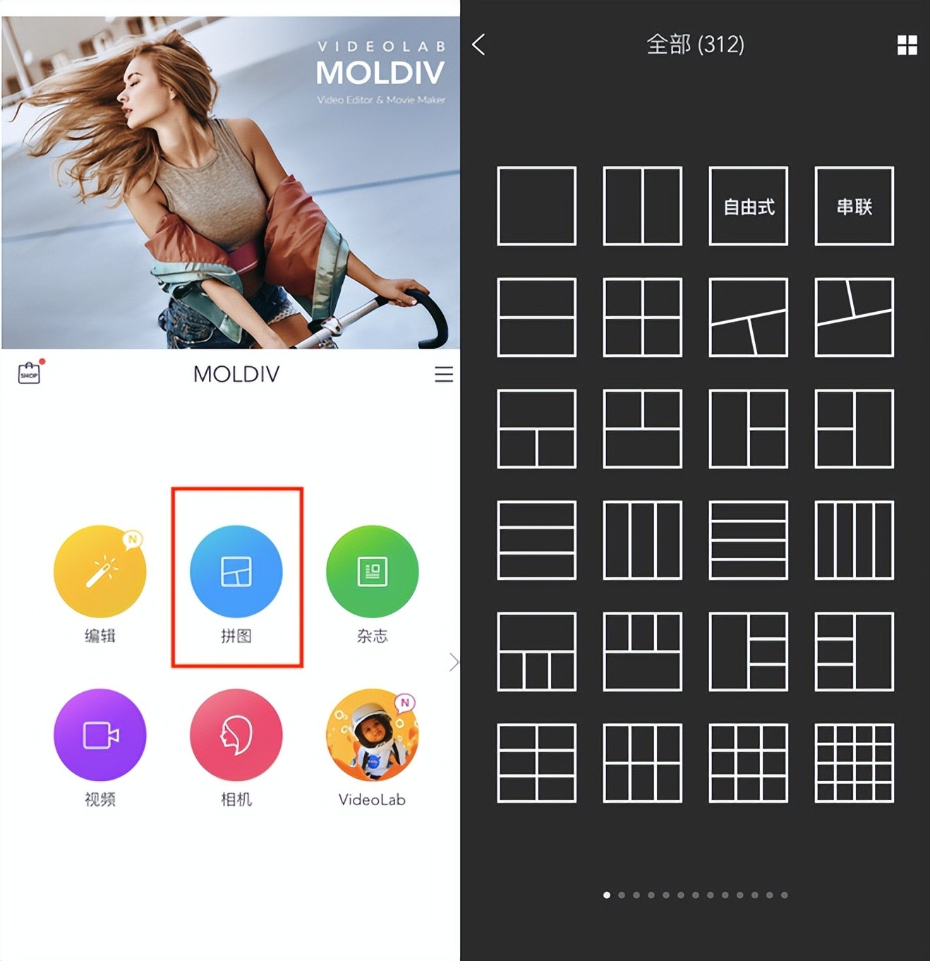 打开工具后,在首页点击"拼图"选项,即见各种模板:宫格、自由式、串联选型任意择取。