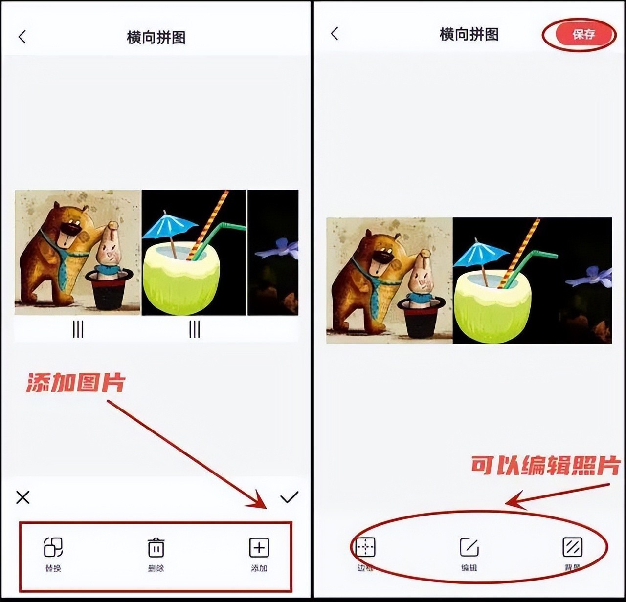 最终,仅需轻点"保存"按钮,它就会自动将这些图片拼接在一起,生成一张全新作品。