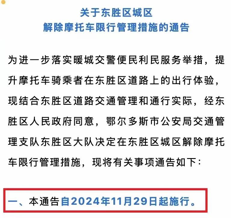 近日鄂尔多斯东胜区交管部门发布通告,宣布自2024年11月29日起解除摩托车限行管理措施,允许摩托车只要符合相关规定即可上路行驶。