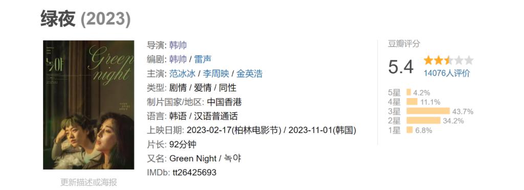 《绿夜》在豆瓣只拿下5.4分,说实话老妹儿还挺失望的。