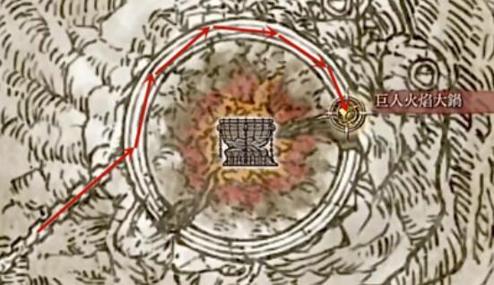 首先火焰大锅其实根本不需要下去,我们只需要沿着大锅的边缘往左边走,来到这个巨人火焰大锅的赐福点上。