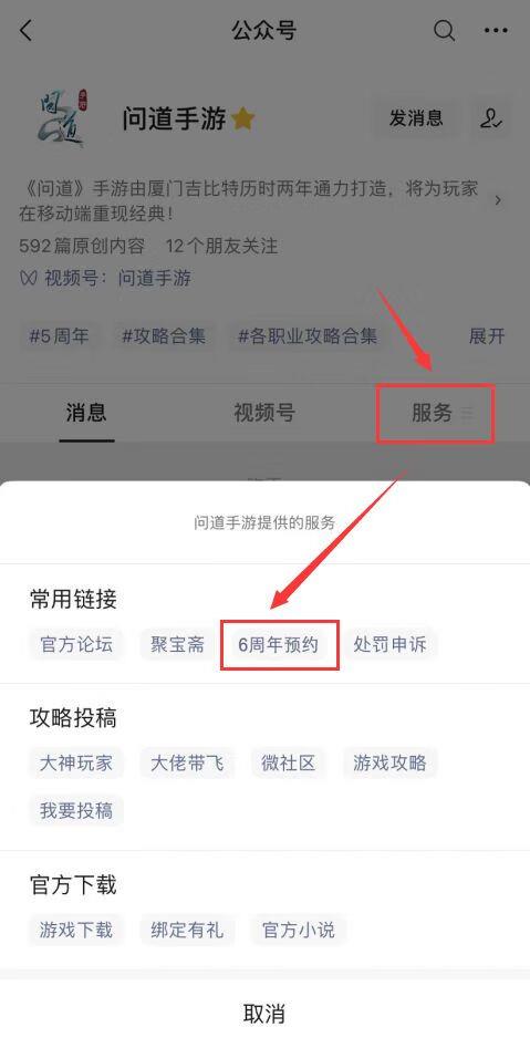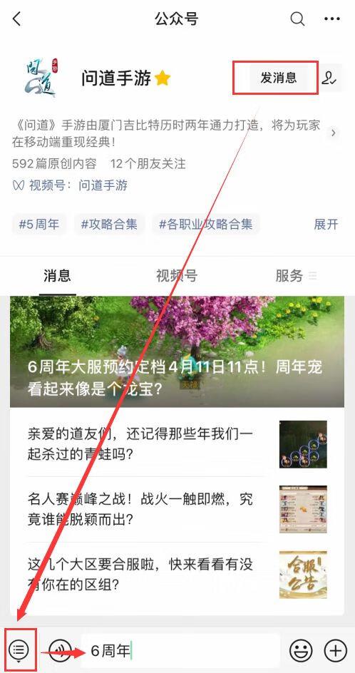 6周年大服预约开启后,道友们也可以进入问道手游公众号,点击右上方的【发消息】按钮私信关键字6周年,点击自动回复中的链接,就能跳转至预约界面了。