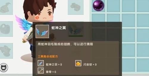 其中最喜欢蛇神之翼,非常的漂亮,不能飞但是可以滑翔,而蛇神之羽就是合成蛇神之翼的,如下图展示,另外还有回旋镖武器,武器飞出去还可以飞回来哦。