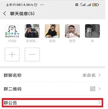 然后返回到群界面,在右侧上方点击“…”图标,并在进入后找到“群公告”并打开它。