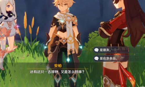 旅行者第一次刚来到大陆时,由派蒙给自己做导游。派蒙带领我们走向第一座城市“蒙德”时,侦察骑士安柏跳了出来,询问我们的来历。在被问到身边这个会飞的“吉祥物”是什么的时候,就有个选项是【应急食品】