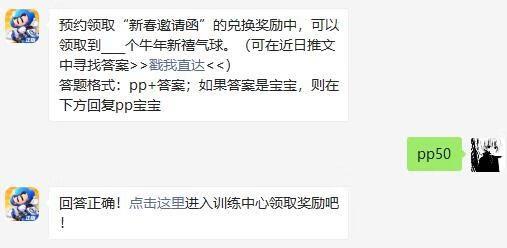 预约领取“新春邀请函”的兑换奖励中,可以领取到____个牛年新禧气球。(可在近日推文中寻找答案>>戳我直达<<)