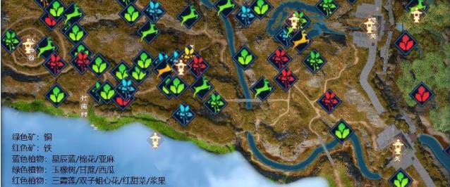 玉橡树的采集位置如图所示,地图上的绿色植物都是可能刷新玉橡树的地点。